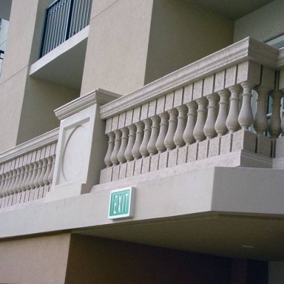 The textured top rails of this balustrade system give the element a bold look. The piers add variety to avoid a monotonous design.