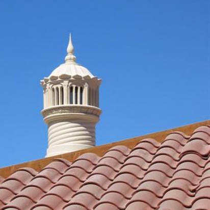 This elaborate chimney cap by Stromberg contains a finial, which provides a satisfying vertical termination to the structure.