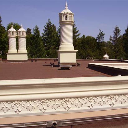 The color and design of these chimney caps were chosen with the building's decorative cornice in mind to ensure a consistent and unified look.