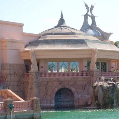 The larger dome in the foreground features a tapered design, various textures, and a seashell finial. The smaller dome is crowned by a custom marlin sculpture.