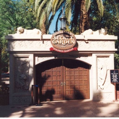 A complex and highly detailed entryway for Siegfried and Roy's Secret Garden. This entryway incorporates impressive doors, signage, and numerous bas relief carvings.
