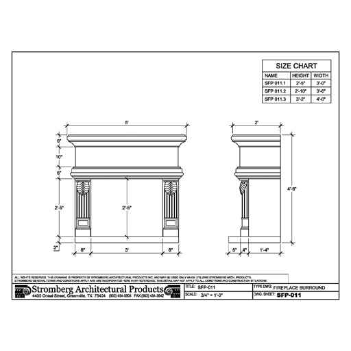 SFP-011 Fireplaces datasheetColumn-inspired sides and a substantial top section are the highlights of this impressive fireplace by Stromberg. Flanking the generously sized fire area are protruding pieces that are fluted to resemble the shafts found on Roman Corinthian columns. Like the grand masterpieces found on architectural wonders, the column-like structures on this fireplace are graced with ornate leaf designs. The thick bases are tapered and topped with smaller pieces that are embellished with single rectangles. Resting above the side posts is an upper section composed of multiple horizontal ledges that end in a straight mantel. Guests and customers will be just as captivated with this surround as the fire that burns within.