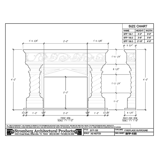 SFP-155 Fireplaces datasheetThe attention-grabbing elements of this Stromberg hearth will make it the heart of any room. The half columns that comprise the sides protrude from the face of the work to provide a highly authentic look. This component features tightly twisted shafts and remarkable bases and caps. The fireplace opening terminates in a sharp triangular peak, and smaller triangles have been placed nearby to attract even more attention to this notable feature. At the top of the work, leaves, stems, and flowers are depicted in abstract form. It's impossible to pinpoint just one aspect of this fireplace as the focal point, but it's a certainty that it will be the center of attention in any space.