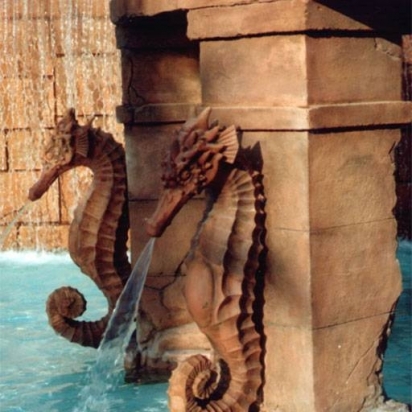 These detailed seahorse sculptures spray cooling streams of water into the pool below. Stromberg has a variety of waterproof materials suitable for fountains and pools.