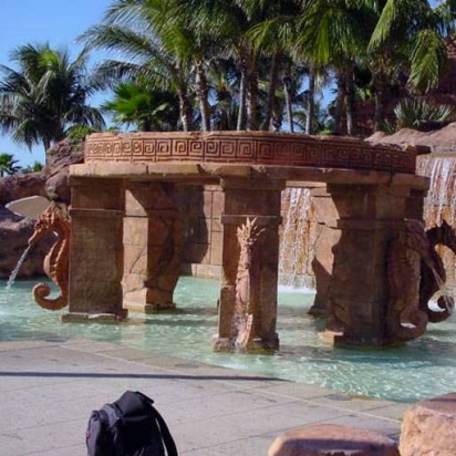 This water feature includes columns, several seahorse sculptures, a crown with engraved patterns, a shallow pool, and some waterfalls in the background to complete the effect.