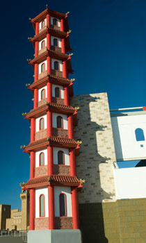 The Asian façade at Winstar draws its inspiration from traditional Chinese and Japanese hallmarks of architectural accomplishment, reproduced by Stromberg. The Great Wall of China, completed during the Ming dynasty, is visible as the centerpiece of this section of Winstar. Also present are a gate and fortified walls from the design of medieval Samurai Castles. The cornerstone of the Asian façade at Winstar is the Pagoda, which originally came from India and meshed with Chinese design to create one of the most recognizable icons of architecture worldwide.
